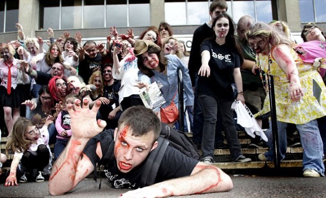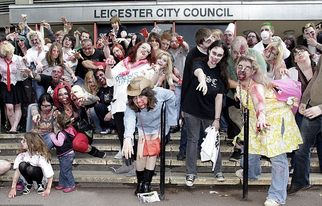 Διακόσια άτομα ντύθηκαν και βάφτηκαν σαν ζόμπι και κατευθύνθηκαν προς το δημαρχείο της πόλης Leicester, στο οποίο μόλις κατέφθασαν άρχισαν να πιέζουν το πρόσωπό τους πάνω στη τζαμαρία θέλοντας να διαδηλώσουν για το «πολιτικό» τους αίτημα. Αυτό δεν ήταν άλλο από το ότι η πόλη δεν ήταν κατάλληλα προετοιμασμένη για μία επίθεση ζόμπι.