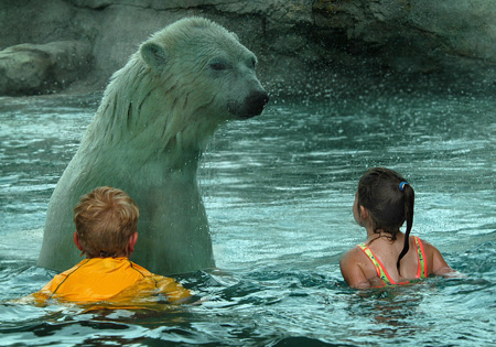 Οι φωτογραφίες, που βλέπετε, είναι πραγματικές, αφού παιδιά και πολικές αρκούδες κολυμπούν μαζί