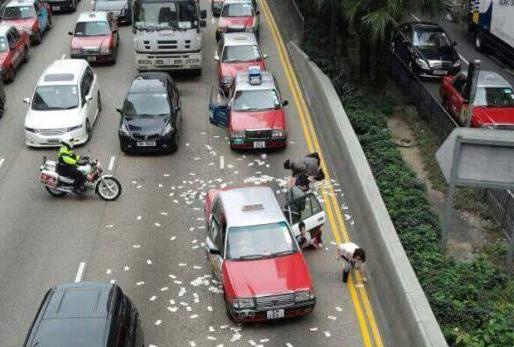 Η κυκλοφορία παρέλυσε στην οδό Γκλάστερ στο κέντρο του Χονγκ Κονγκ καθώς οδηγοί ταξί βγήκαν από τα οχήματά τους προκειμένου να πάρουν κάποια από τα εκατοντάδες χαρτονομίσματα που σκορπίστηκαν σε αυτόν τον πολυσύχναστο δρόμο.