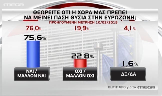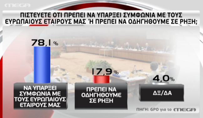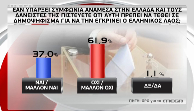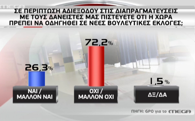 Την άποψη των πολιτών σχετικά με το ενδεχόμενο δημοψηφίσματος, πρόωρων εκλογών, Grexit αλλά και την εξέλιξη των διαπραγματεύσεων, καταγράφει νέα δημοσκόπηση της GPO για λογαριασμό του Mega.