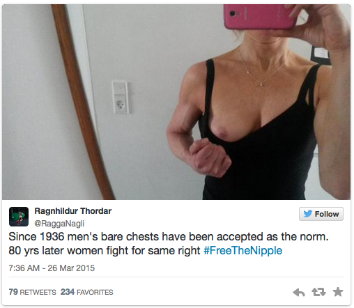Αποκαρδιωμένη, έσβησε το tweet της, όμως λίγα λεπτά αργότερα άλλαξε γνώμη και το ανέβασε ξανά με το δημοφιλές φεμινιστικό hashtag #FreetheNipple, επισημαίνοντας ότι τα μέσα κοινωνικής δικτύωσης αντιμετωπίζουν με δύο μέτρα και δύο σταθμά το γυναικείο και το ανδρικό γυμνό.