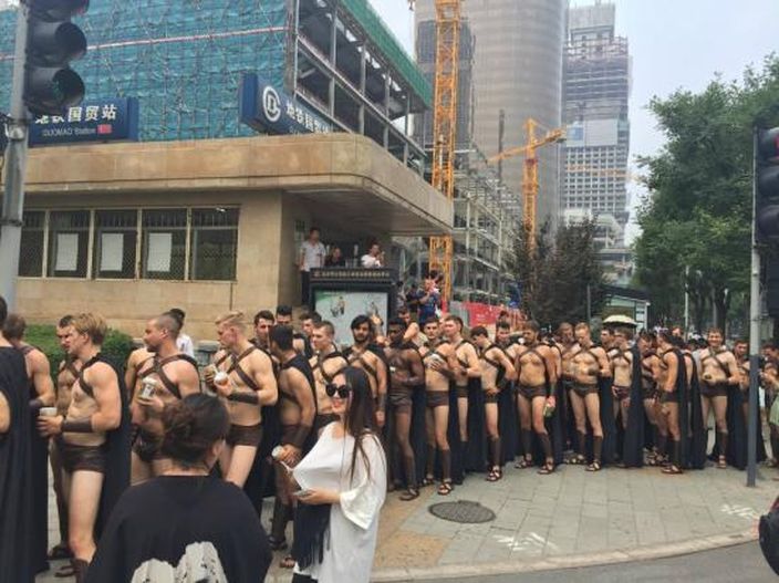 Ένα ασυνήθιστο θέαμα περίμενε διάφορους περαστικούς στο Πεκίνο. Περίπου 100 άντρες ντυμένοι «Σπαρτιάτες» βρέθηκαν στον δρόμο στο πλαίσιο προώθησης προϊόντων της εταιρείας διανομής τροφίμων Sweetie Salad.