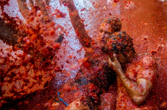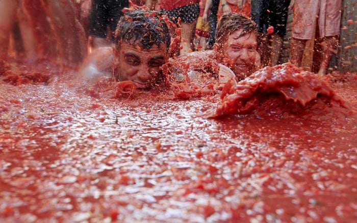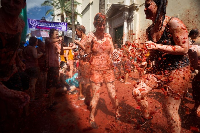 Στην φετινή «La Tomatina» 140 τόνοι ντομάτες έβαψαν στα κόκκινα τους δρόμους της πόλης ενώ στην εκδήλωση, που διοργανώθηκε έξω από το δημαρχείο της πόλης, συμμετείχαν πάνω από 22.000 άνθρωποι, μεταξύ των οποίων πολλοί τουρίστες.Φορτηγά με ντομάτες, συνολικής αξίας περίπου 30.000 ευρώ, κατέφθασαν το πρωί για να μεταφέρουν τα πυρομαχικά έξω από το σημείο της έναρξης του Φεστιβάλ και μόλις το έναυσμα δόθηκε, οι συμμετέχοντες άρχισαν να πετούν ντομάτες ο ένας στον άλλον και το ξέφρενο πάρτι διήρκεσε πολλές ώρες.