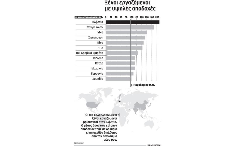Αυτό προκύπτει από στοιχεία της HSBC Holdings Switzerland για το Bloomberg, που δημοσιεύεται στα Νέα. Σύμφωνα με αυτά οι ξένοι υπήκοοι που εργάζονται στην Ελβετία έχουν μέσο ετήσιο μισθό 188.275 δολάρια τον χρόνο.