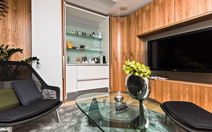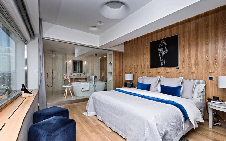 Η σουίτα είναι επιπλωμένη με απλά αλλά πολυτελή υλικά και εξοπλισμένη με μίνι μπαρ, ψυγείο, καφετιέρα και μεγάλη τηλεόραση.