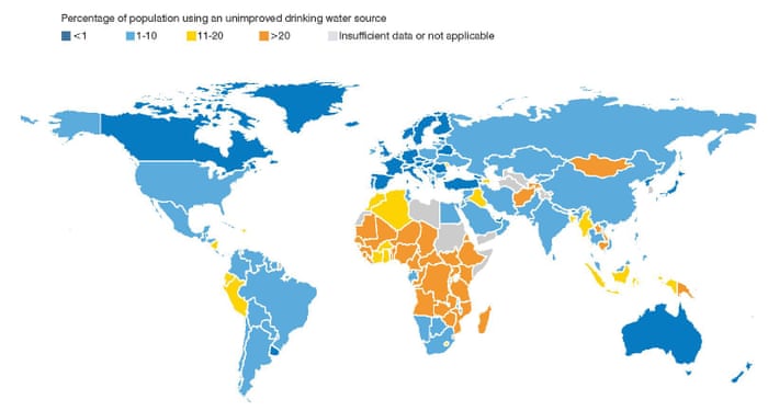 Ένας στους 9 κατοίκους του πλανήτη, περίπου 2,6 δισ. άνθρωποι, δεν έχουν πρόσβαση σε καθαρό νερό. Το 80% των ασθενειών στις αναπτυσσόμενες χώρες συνδέονται με το βρόμικο νερό και τις συνθήκες υγιεινής. Ενώ το 1/3 της ανθρωπότητας είναι μόνιμα άρρωστο, εξαιτίας του ακάθαρτου νερού, και 10 εκατ. άνθρωποι πεθαίνουν τον χρόνο από το νερό που πίνουν.