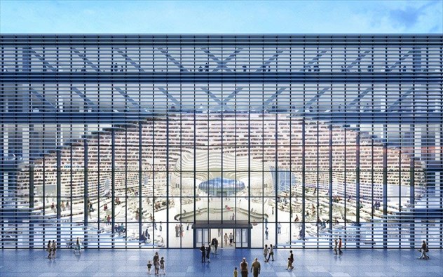 και αποτελεί επίτευγμα της αρχιτεκτονικής και της τεχνολογίας. Καμία σχέση με την παραδοσιακή βιβλιοθήκη με τα ξύλινα ράφια και τους τόμους σε κοινή θέα.