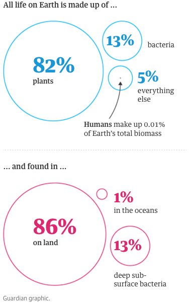 Η ανθρωπότητα αναπτύχθηκε με δραματικούς ρυθμούς σε ένα σύντομο χρονικό διάστημα μέσω της γεωργίας, του ζωικού κεφαλαίου και της Βιομηχανικής Επανάστασης, αλλά όπως σημειώνουν οι συγγραφείς, οι άνθρωποι σήμερα αποτελούν ένα σχετικά μικρό ποσοστό της τάξεως του 0,01% όλης της ζωής στον πλανήτη.